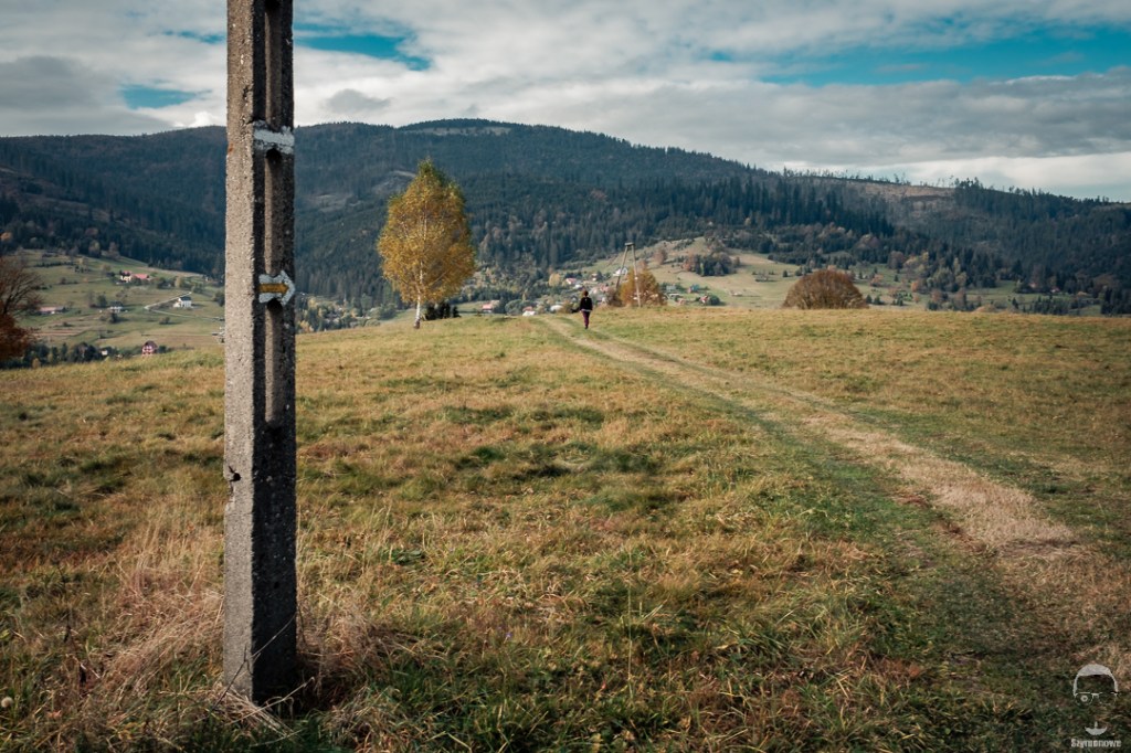 Mianowicie żółty szlak biegnący na Krawców przez Soblówkę zakręca na Młynarzowej. Do tego momentu jest dobrze oznakowany. Należy iść polną drogą, aż minie się coś, co autochtoni nazywają „piramidą” (zdjęcie poniżej). Następnie dojdziemy do zabudowań, będą to trzy stojące blisko siebie domy. Szlak skręca tutaj w lewo, między domami, a potem znowu w lewo na starą drogę gminną. Potem znowu jest dobrze oznakowany. To właśnie ten „młynorzowiański” odcinek wprowadza ludzi w błąd 🙂