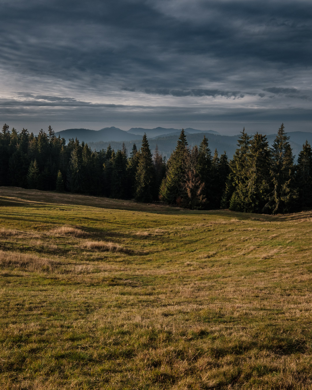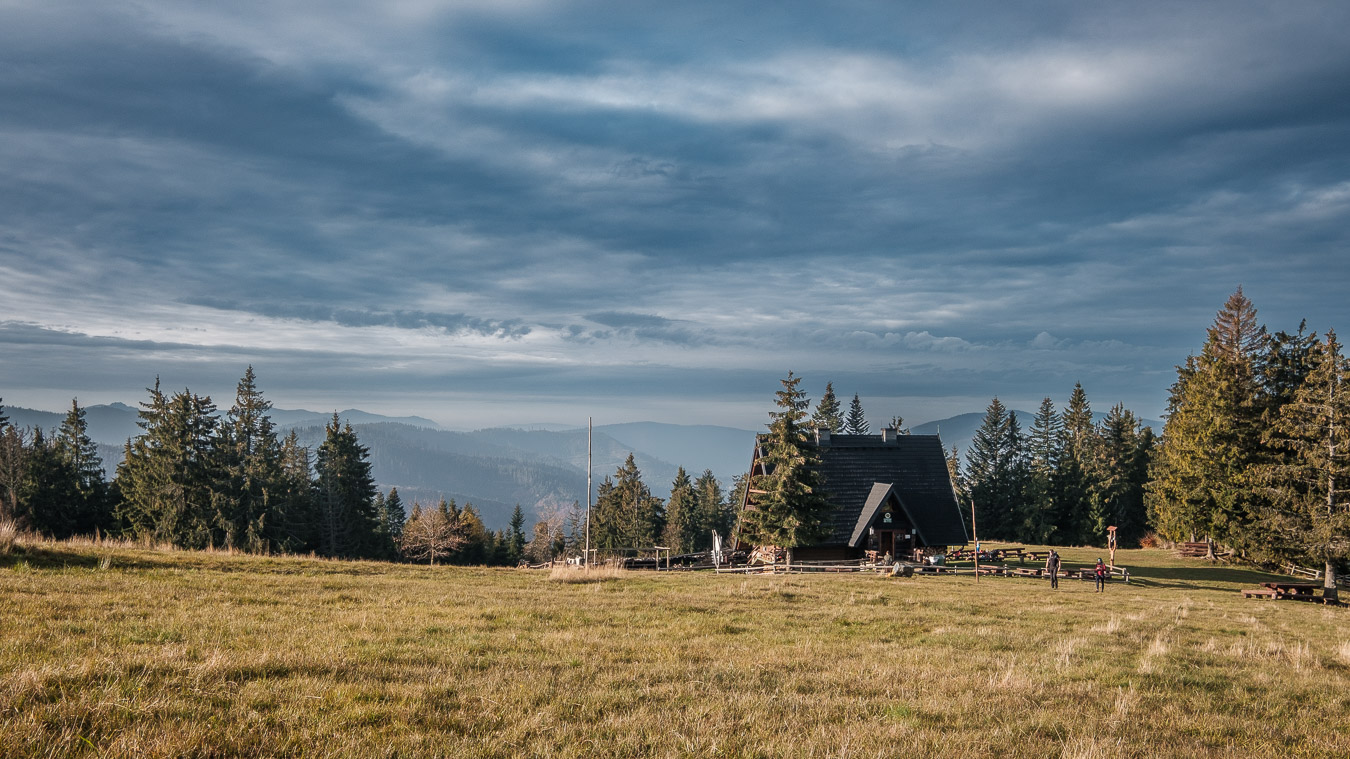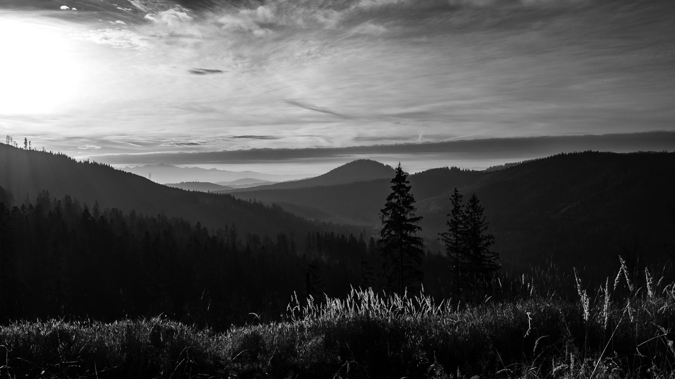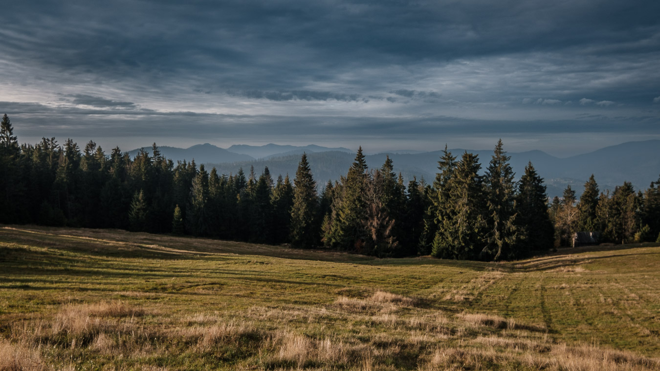 Krawców chodził mi po głowie już od dłuższego czasu i w końcu udało mi się tam wybrać. Ruszyłem przed świtem żółtym szlakiem z Młynarzowej, tak żeby zastać na szczycie fajne światło. Przez połowę wyprawy warunki były nieziemskie. To był jeden z tych poranków, za które fotograf bez wahania oddałby nerkę i połowę wątroby. Niestety później się zachmurzyło i gdy dotarłem na górę to wiedziałem, że zdjęcia nie wyjdą tak jak sobie zaplanowałem. Dodatkowo widoczność tego dnia była raczej średnia. O ile ta kiepska widoczność dodawała zdjęciom uroku przy porannym miękkim świetle, tak przy pełnym zachmurzeniu raczej przeszkadzała. Mówi się trudno. Zrobiłem kilka zdjęć, a potem schowałem aparat do plecaka, gdzie spędził resztę wycieczki.