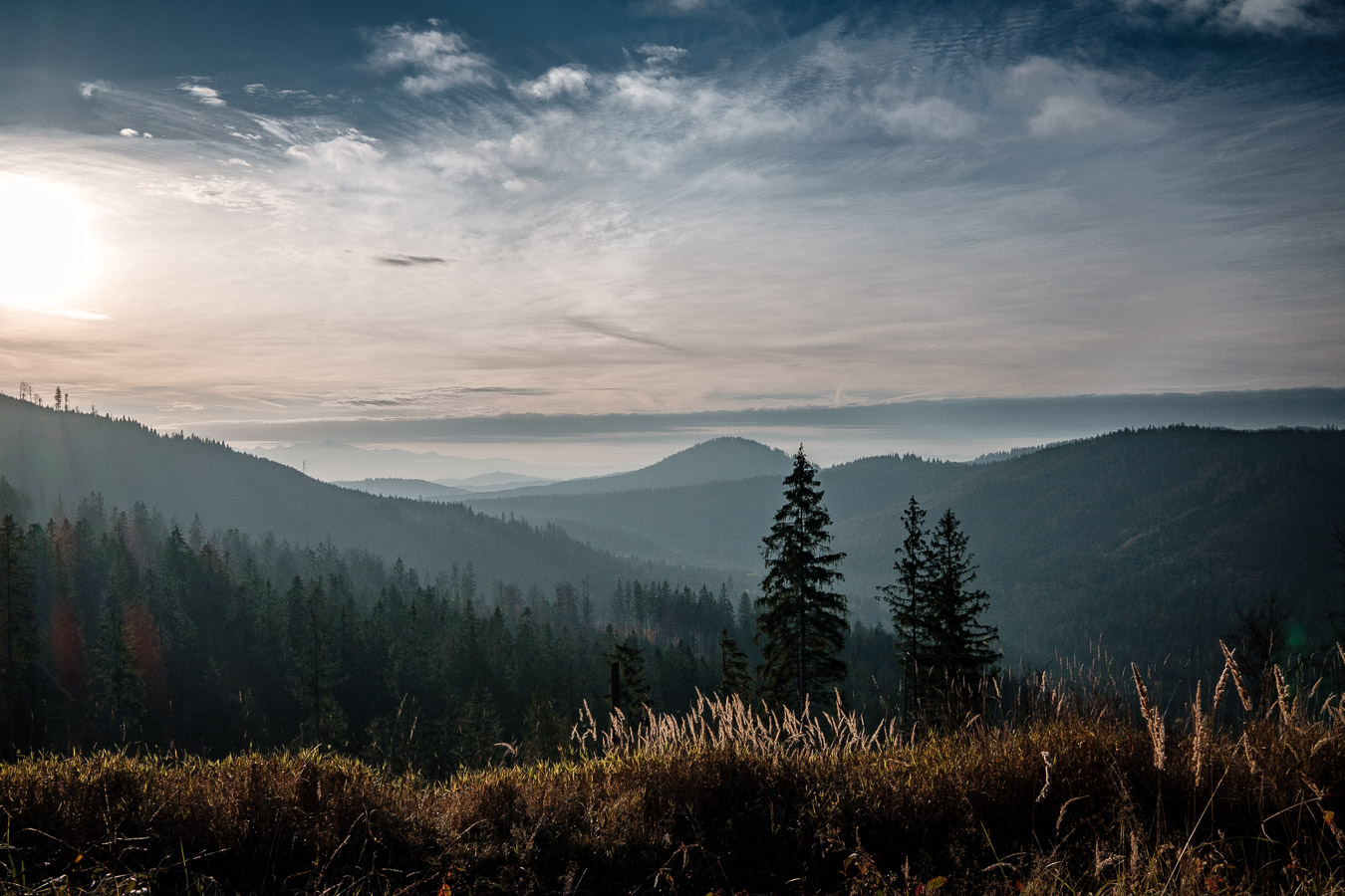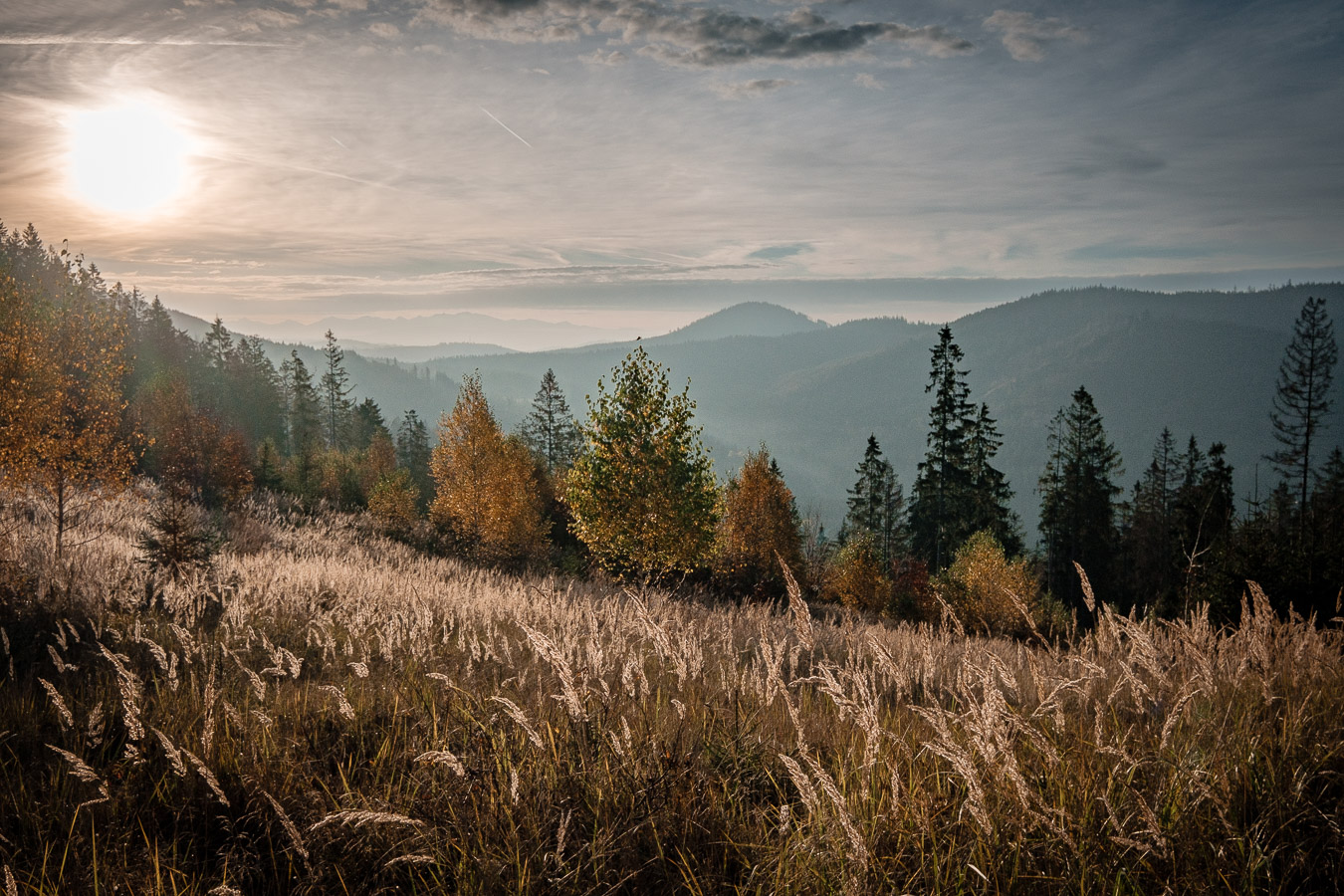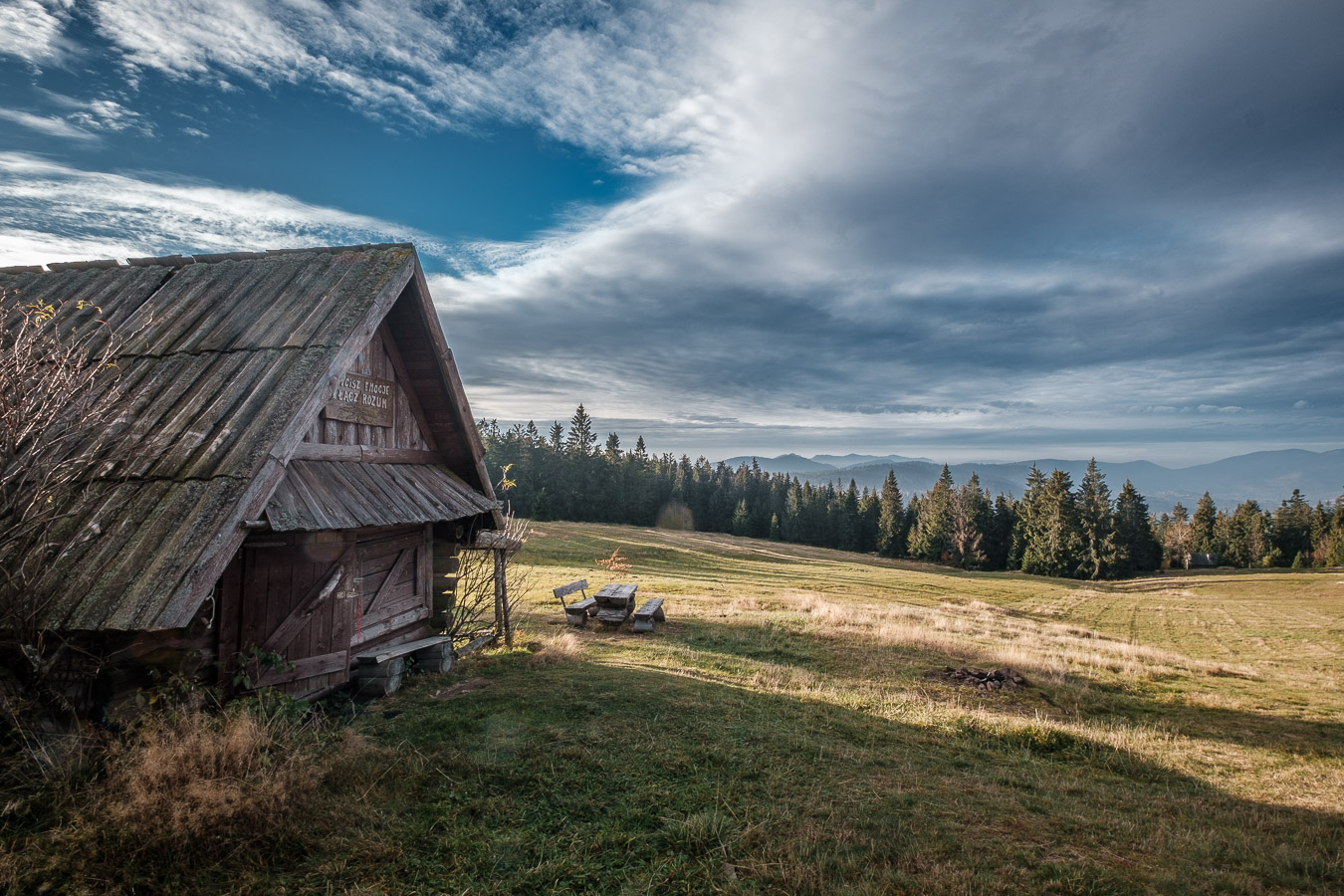 Krawców chodził mi po głowie już od dłuższego czasu i w końcu udało mi się tam wybrać. Ruszyłem przed świtem żółtym szlakiem z Młynarzowej, tak żeby zastać na szczycie fajne światło. Przez połowę wyprawy warunki były nieziemskie. To był jeden z tych poranków, za które fotograf bez wahania oddałby nerkę i połowę wątroby. Niestety później się zachmurzyło i gdy dotarłem na górę to wiedziałem, że zdjęcia nie wyjdą tak jak sobie zaplanowałem. Dodatkowo widoczność tego dnia była raczej średnia. O ile ta kiepska widoczność dodawała zdjęciom uroku przy porannym miękkim świetle, tak przy pełnym zachmurzeniu raczej przeszkadzała. Mówi się trudno. Zrobiłem kilka zdjęć, a potem schowałem aparat do plecaka, gdzie spędził resztę wycieczki.