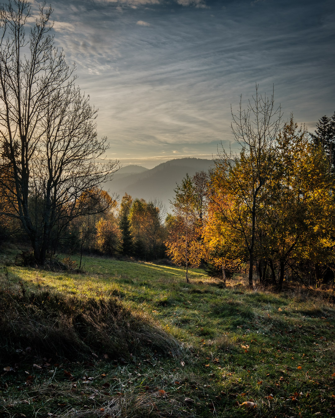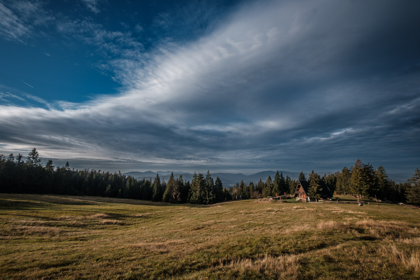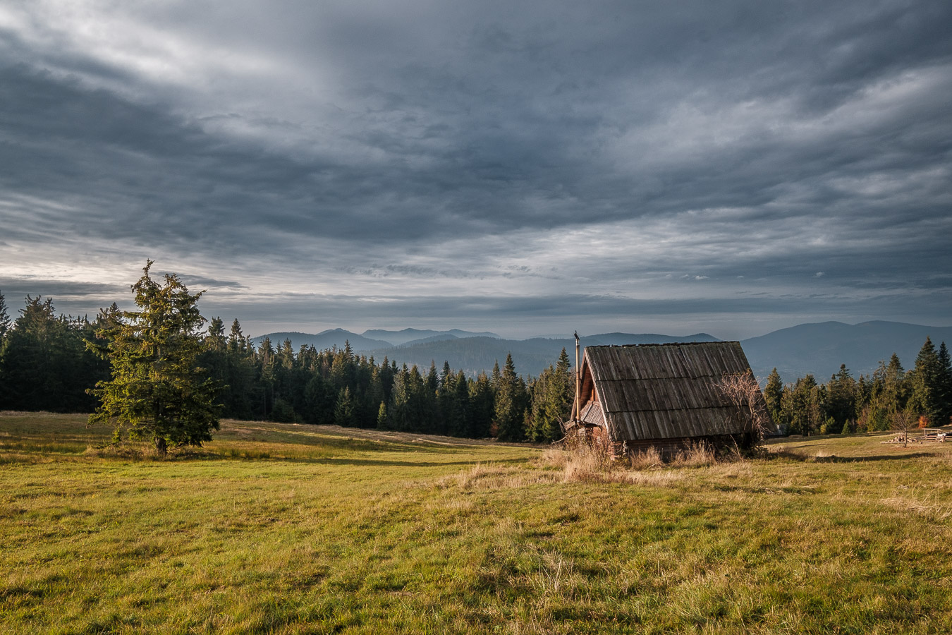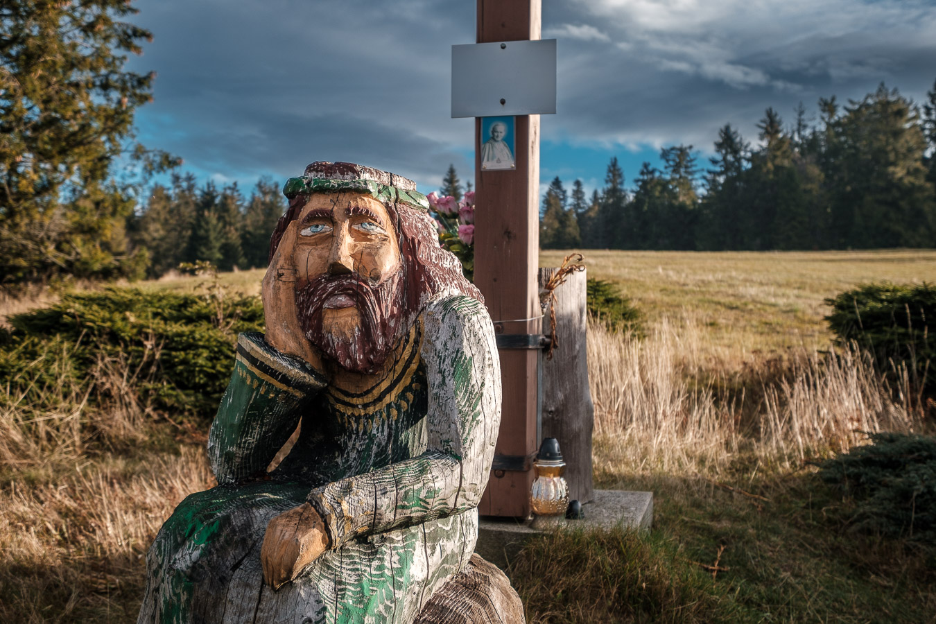 Krawców chodził mi po głowie już od dłuższego czasu i w końcu udało mi się tam wybrać. Ruszyłem przed świtem żółtym szlakiem z Młynarzowej, tak żeby zastać na szczycie fajne światło. Przez połowę wyprawy warunki były nieziemskie. To był jeden z tych poranków, za które fotograf bez wahania oddałby nerkę i połowę wątroby. Niestety później się zachmurzyło i gdy dotarłem na górę to wiedziałem, że zdjęcia nie wyjdą tak jak sobie zaplanowałem. Dodatkowo widoczność tego dnia była raczej średnia. O ile ta kiepska widoczność dodawała zdjęciom uroku przy porannym miękkim świetle, tak przy pełnym zachmurzeniu raczej przeszkadzała. Mówi się trudno. Zrobiłem kilka zdjęć, a potem schowałem aparat do plecaka, gdzie spędził resztę wycieczki.