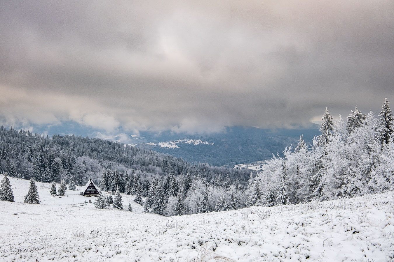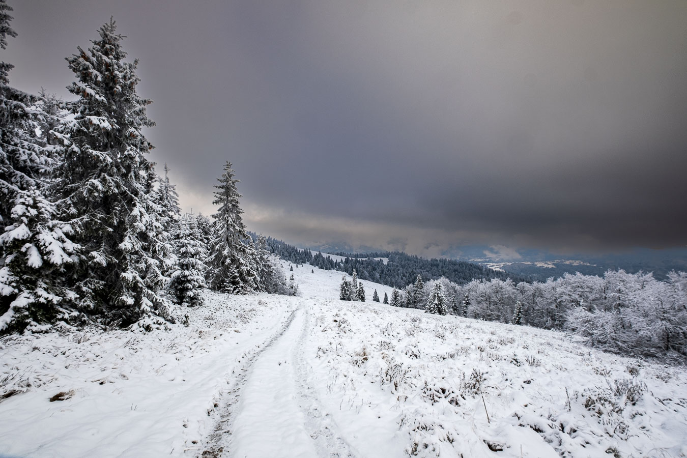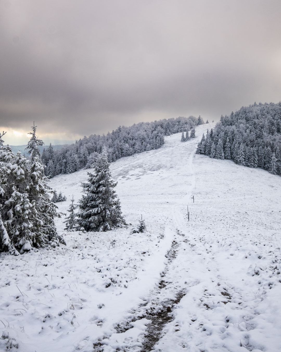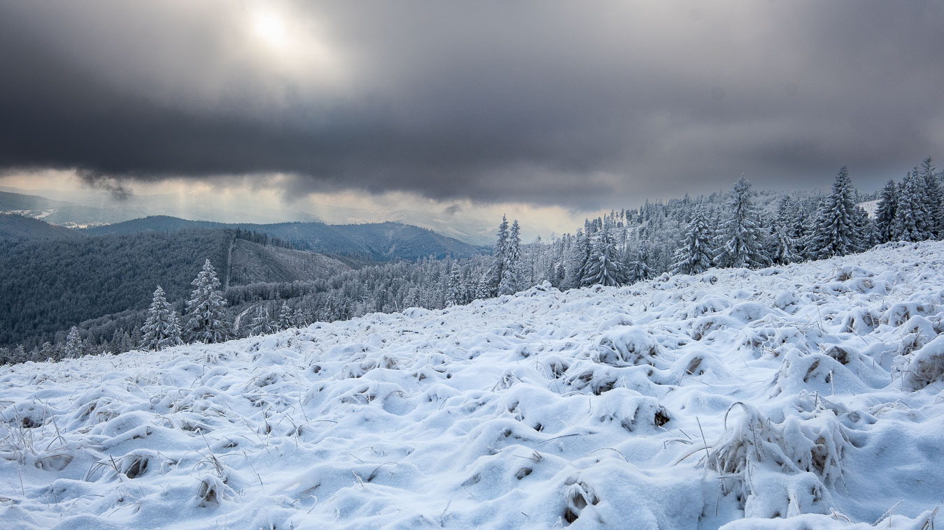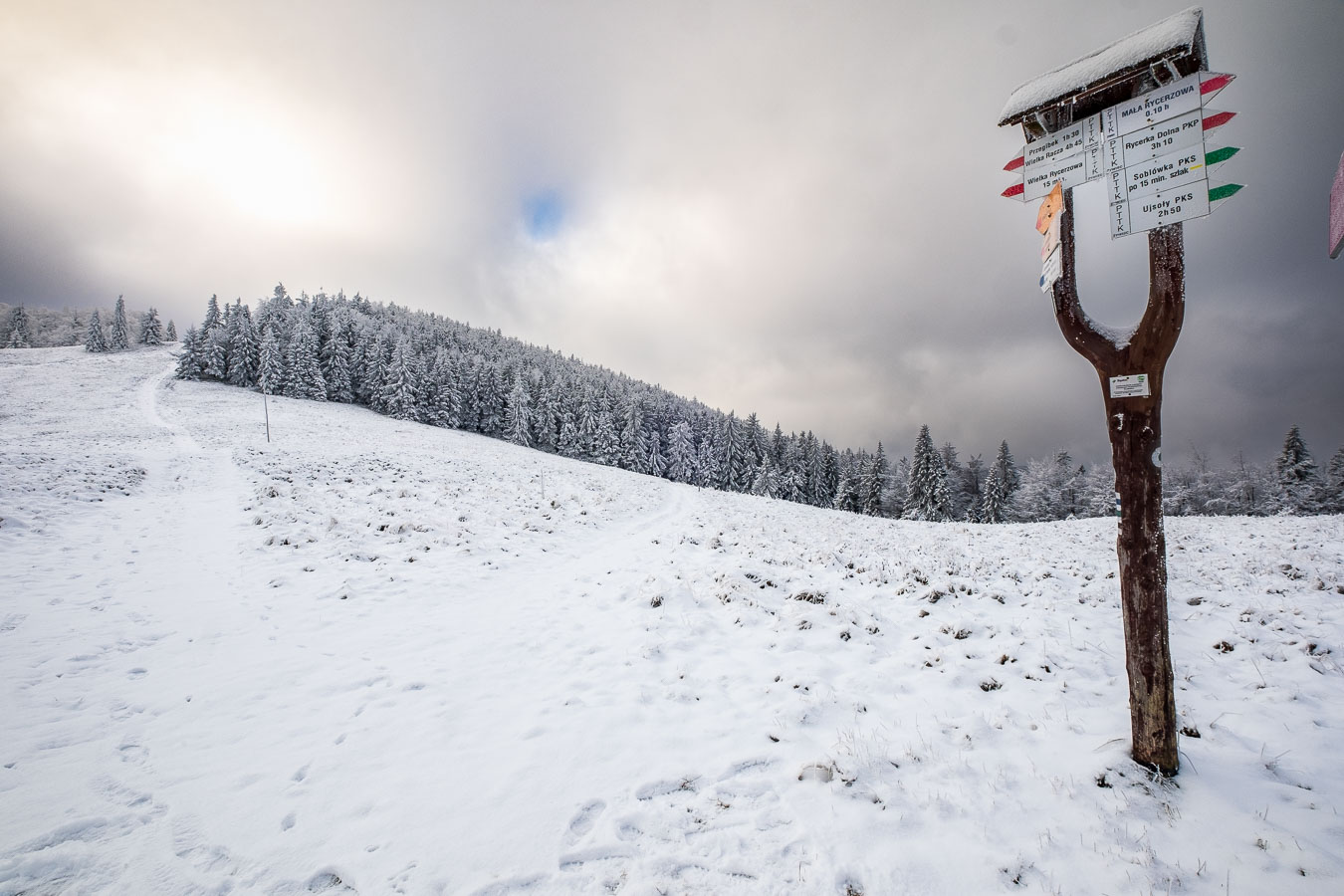 Jak to zwykle bywa w moich samotnym wyprawach, musiałem się najeść nieco strachu. I to dwa razy! Mój pierwszy raz był zaraz za Przełęczą Kotarz. Dla jasności, pierwszy raz, kiedy odczułem strach tego dnia. Wchodzę sobie na zielony szlak na Wiertalówkę. Patrzę, a tu pełno świeżych śladów. Śladów nie byle kogo, bo wilków. Myślę sobie: „Kurde. Taką dobrą swojską kiełbachę se wziąłem na drugie śniadanie. Przyjdą bestie kupą i mi to zeżrą…” A tak całkiem poważnie to serce zabiło mi nieco mocniej, ale spokojnie ruszyłem dalej. Wilki szły w przeciwną stronę, a dodatkowo mało prawdopodobne, żeby narobiły mi jakichś kłopotów, bo od bodaj 1945 nie odnotowano w Polsce ataku wilka na człowieka. Tak więc poszedłem sobie elegancko na Wiertalówke, gdzie czekało mnie coś dużo gorszego…